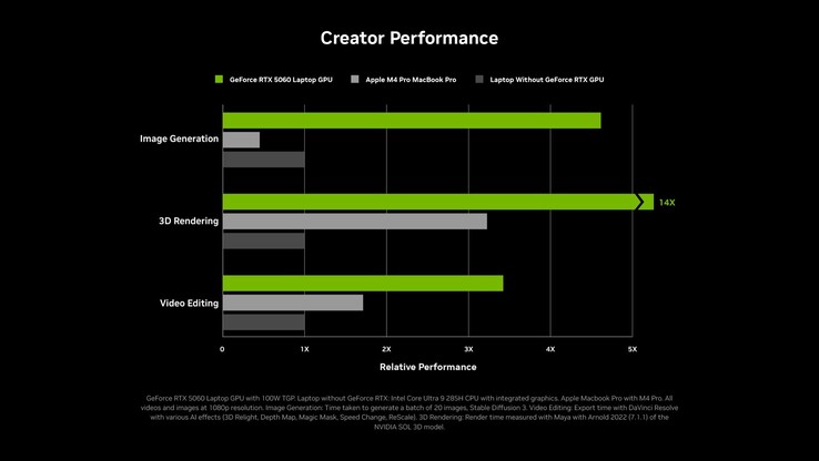 Im Vergleich zu Notebooks ohne dedizierten Grafikchip bietet NVIDIA GeForce zahlreiche Vorteile, wie dedizierte Raytracing-Hardware-Beschleuniger, die in 3D-Software wie Blender die Render-Zeit von mehreren Stunden auf wenige Minuten reduzieren können, und selbst die Performance des Apple M4 Pro um ein Vielfaches übertreffen.