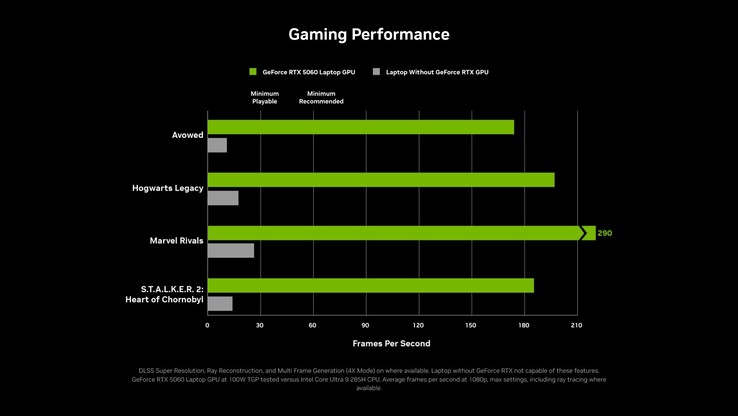 Durch die fortschrittliche Blackwell-Architektur und DLSS 4 kann schon die NVIDIA GeForce RTX 5060 Laptop-GPU Blockbuster wie Hogwarts Legacy, S.T.A.L.K.E.R. 2 oder Marvel Rivals mit mehr als 180 Bildern pro Sekunde darstellen, und zwar in 1.080p-Auflösung mit maximalem Detailgrad.