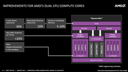 Doch woher kommt die plötzliche Mehrleistung? Ein entscheidender Grund dürfte die Aufteilung beziehungsweise Verdoppelung des bislang zwischen zwei Integer-Kernen geteilten Decoders sein – statt nur einem gibt es nun also zwei eigenständige Decoder pro Modul. Das kostet zwar Transistoren und Leistungsaufnahme, verbessert aber gleichzeitig auch die Auslastung und trägt so zu einer höheren Performance bei. Wenn man so will, weicht AMD mit dieser Maßnahme das eigentliche Modul-Konzept wieder ein Stück weit auf. Darüber hinaus sollen eine verbesserte Load/Store-Einheit, größere Register, eine optimierte Sprungvorhersage sowie ein aufgebohrter L1 Instruction Cache (96 statt 64 KB pro Modul) zur Leistungssteigerung beitragen.