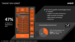 Fast die Hälfte der Chipfläche Kaveris geht auf das Konto der Grafikeinheit – reichlich Platz also, den AMD für eine Steigerung der Shaderzahl von 384 (Trinity/Richland) auf nunmehr 512 ALUs beziehungsweise 8 Compute Cores nutzt. Des Weiteren setzt die GPU jetzt nicht mehr auf das angestaubte VLIW-Design, sondern die moderne GCN-1.1-Architektur aktueller Radeon-Grafikkarten. Dies steigert zum einen Energieeffizienz und Hardwareauslastung, zum anderen kann die APU so auch mit DirectX 11.2 "Tier 2" und AMDs Mantle-API umgehen.
