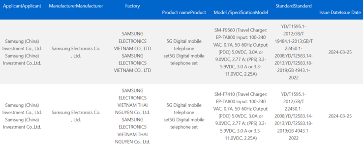 Aktuell wurden im Zusammenhang mit den beiden nahenden Foldables die erste Zertifizierung entdeckt und zwar in Bezug auf die Ladegeräte, die einmal mehr mit 25 Watt spezifiziert werden. Sowohl das Galaxy Z Fold6 mit Modellnummer SM-F9560 als auch der Nachfolger des Galaxy Z Flip5 (hier bei Amazon erhältlich) mit Modellnummer SM-F7410 wurden bei der chinesischen 3C-Behörde beobachtet, wie der Screenshot unten vom X-User @ZionsAnvin bestätigt.
