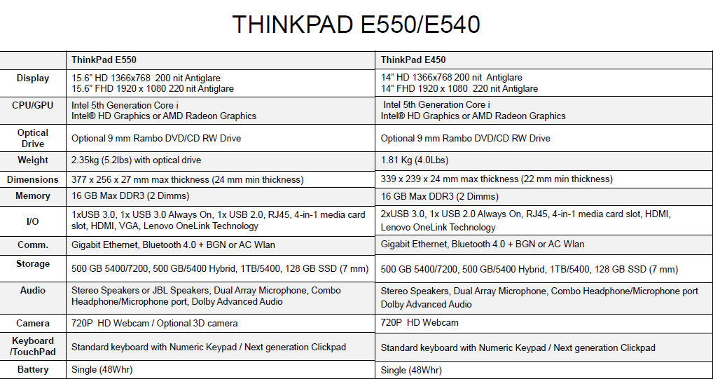 Lenovos ThinkPad-Einsteigerserie „E“ erhält mit den Notebooks E450 und E550 ein Broadwell-Update. Sie werden also mit den neusten Intel-Core-i-Prozessoren der fünften Generation ausgestattet – wie übrigens alle neuen ThinkPads. Das E450 ist 14 Zoll groß und das E550 misst 15,6 Zoll. Ansonsten haben die Geräte dieselben Features. Es gibt ein neues Full-HD-Display zur Auswahl. Die Akkuleistung soll sich im Vergleich zur letzten Generation verbessert haben. Die Kunden werden sich optional Radeon-Grafikkarten von AMD aussuchen können. Ebenso steht eine 3D-RealSense-Kamera als Option bereit. Beide Notebooks sind mit der Lenovo-One-Link-Technologie kompatibel – also mit Lenovos hauseigenem Dock, der für zusätzliche Anschlüsse sorgt. Den Vorgänger E540 bewerteten wir im Test mit 82 Prozent.