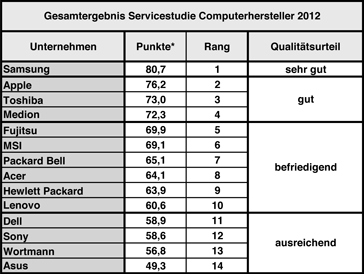 Während es Samsung im Jahr 2011 noch gelang, sich deutlich vor dem Konkurrenten Apple zu platzieren, so konnte Apple in diesem Jahr mit 76,2 Punkten nun zu seinem Rivalen (80,7 Punkte) aufschließen. Allerdings heißt der Testsieger und damit zum fünften Mal in Folge "Bester Computerhersteller": Samsung. In allen Bereichen zeigte das Unternehmen laut Studie die höchste Servicequalität.