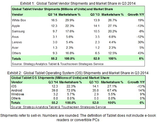 Die Marktanalysten von Strategy Analytics haben ihre Einschätzung für das 3. Quartal 2014 im Tablet-Markt fertig und veröffentlicht. Laut diesen Zahlen erreichte das weltweite Absatzvolumen bei den Tablet-PCs eine Höhe von 55,2 Millionen Geräten. Das entspricht einem Plus von 6 Prozent im Vergleich zu den 52 Millionen im Vergleichszeitraum des Vorjahres.