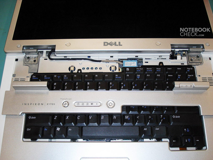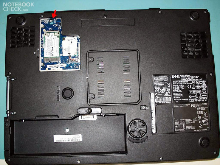 Als allererstes, bevor man zum Inneren des Laptops vordringen kann, müssen der Akku und die Festplatte entfernt werden. Auch die WLAN Karte muss entfernt werden, weil man sonst den Bildschirm nicht abmontieren kann. Leider ist das Dell Inspiron E1705 so gestaltet, dass man praktisch nichts reparieren kann, ohne den Bildschirm abzumontieren. Noch ist es ein langer Weg, bis man dorthin kommt...