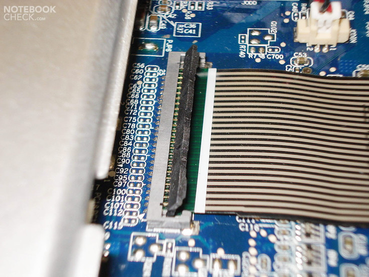 Der Tastaturkabel kann abgezogen werden, indem man die schwarze Abdeckung auf der Seite des Flachbandkabels anhebt. Dabei soll nicht am grauen Stecker gezogen werden, denn dieser ist mit der Platine verlötet.