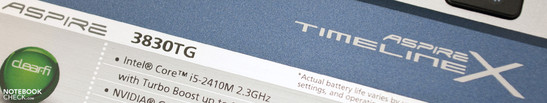 Acer lässt es sich nicht nehmen die flotte Hardware aus den größeren Geräten auch im kleinsten Chassis unterzubringen. Als Prozessor bietet das günstige 3830TG einen Intel Core i5-2410M Dual-Core Prozessor mit einem Basistakt von 2,3 GHz, der je nach Anwendung auf bis zu 2,9 GHz über die Turbo Boost Technologie hochgefahren und durch Hyper Threading (2 Kerne, 4 Threads) unterstützt wird. Zusätzlich befindet sich im Portfolio auch eine teurere Variante mit dem schnelleren Intel Core i7-2620M mit einem Takt von 2,7 GHz (Turbo Boost: 3,3 GHz).