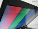 Das verbaute spiegelnde Breitbilddisplay mit einer Auflösung von 1280x800 Pixel bietet mit durchschnittlich 140 cd/m² eher durchschnittliche Helligkeitswerte die den Einsatz im Freien kaum ermöglichen (wegen den Spiegelungen). Hinzu kommt noch, dass das Alb die Helligkeit im Akkubetrieb auf maximal 118,8 cd/m² drosselt. Der erreichbare Konstrast ist mit 226:1 wegen der mittelmäßigen Helligkeit auch nicht berauschend. Die Ausleuchtung von knapp 80% ist mittelmäßig.