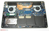 Um an die Innereien zu gelangen, muss die Unterschale des Rechners entfernt werden. Der Vorgang ist recht einfach durchzuführen. Als erstes werden die beiden hinteren Gummifüße abgelöst. Unter diesen befindet sich jeweils eine Schraube (Kreuzschlitz). Diese müssen entfernt werden. Anschließend werden die sichtbaren Schrauben (Torx) auf der Unterseite des Rechners entfernt. Danach kann die Unterschale abgenommen werden.