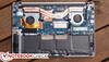 Ein Problem, wie schon beim G501, sind sicherlich die eingeschränkten Wartungsmöglichkeiten – nicht weil Upgrades nicht möglich sind (sie sind es), sondern weil die Zugänglichkeit durch die Konstruktion der Unterseite eingeschränkt ist. Um die Klappe zu entfernen und die internen Komponenten zu erreichen, müssen nicht nur 10 Torx-Schrauben gelöst werden, sondern auch noch zwei versteckte Kreuzschrauben unter den beiden vorderen Gummifüßen zu beachten. Diese sind durch doppelseitiges Klebeband fixiert, somit wird das Entfernen schwierig und unpraktisch. Falls man diese Klappe jedoch endlich mal entfernt hat, sieht man, dass fast alle wichtigen Komponenten zugänglich sind: RAM, M.2-SSD, WLAN-Modul, Lüfter und den Akku, um nur die wichtigsten Teile zu nennen.