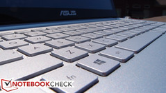 Die Chiclet-Tastatur des ZenBook Pro ist grundsätzlich komfortabel zu bedienen, allerdings haben wir zunächst einige Anschläge verpasst, bevor wir unterbewusst etwas mehr Druck ausgeübt haben als zuvor. Der Hub von 1,6 mm ist eher knapp, für den Autor aber passend. Ebenso zufrieden sind wir mit dem Feedback als auch dem Tastenabstand. Einige Tasten waren etwas lockerer und sprachen subjektiv etwas schlechter an (z. B. Backspace), aber im Großen und Ganzen ist das Schreibgefühl ansprechend. Auch die Integration eines separaten Nummernblocks gefällt uns gut. Die Tastatur verfügt über eine Hintergrundbeleuchtung, die in vier Stufen reguliert werden kann (Aus, Niedrig, Mittel und Hoch). Asus wurde in der Vergangenheit einige Male für den geringen Kontrast zwischen den Tasten und der Schrift kritisiert. Dieses Problem besteht auch beim UX501, vor allem wenn die Beleuchtung in etwas dunkleren Umgebungen aktiv ist. Es ist kein großes Problem, aber hier steht das Design offenbar über der Funktion.