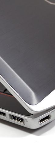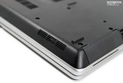 Die rechte Seitenkante nimmt im vorderen Bereich einen 45mm Expresscard Slot und darunter liegend das modulare optische Laufwerk auf. Es folgen zwei USB 2.0 Ports sowie eine kombinierte USB/eSATA Buchse. An der Rückseite finden wir schließlich den HDMI-Port und die Öffnung zur Anbringung eines Kensington-Schlosses. Ein SD-Card Reader ist über die Vorderkante des Notebooks zugänglich.