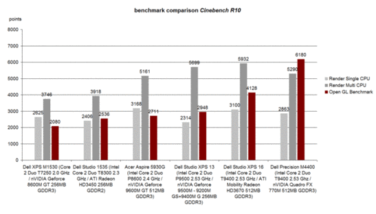 Ein überaus interessantes Ergebnis bringt auch der Cinebench R10 Benchmarktest von Maxxon. Interessant in zweierlei Hinsicht: So kann die eingesetzte T9400 Core 2 Duo CPU von Intel den an sich baugleichen Chip im hauseigenen Dell Precision M4400 sowohl im Singlecore als auch im Multicore Benchmarktest um mehr als 10% toppen.