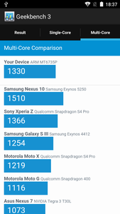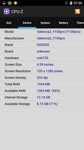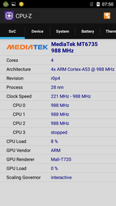 Anstatt denselben 1,7 GHz schnellen MediaTek-MT6592-SoC samt Mali-450-MP4-GPU wie beim Y100 zu benutzen, hat Doogee das Pro-Modell mit dem langsameren 1,5 GHz MediaTek-MT6735-SoC und der Mali-T720-GPU ausgestattet. Laut CPU-Z läuft der Quad-Core in unserem Y100 Pro aber nur mit 1,0 GHz, was auch von PCMark bestätigt wird. Im Leerlauf werden alle Kerne bis auf einen deaktiviert, der mit 221 MHz taktet um Energie zu sparen.