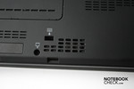 Auf der linken Seite befinden sich von vorne nach hinten zunächst ein Card-Bus-Steckplatz, darunter der Hardwareschalter für die drahtlose Kommunikation und ein USB 2.0-Steckplatz. Es folgt der LAN-Port mit bis zu einem Gigabit Übertragungskapazität, sowie der VGA-Steckplatz, der Lüfter, der Stromeingang und ganz hinten ein Anschluss für ein Kensington Lock.