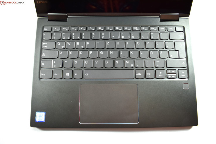Lenovo verbaut im Yoga 730-13IKB eine Chiclet-Tastatur mit sechs Tastenreihen. Das Layout hat sich im Vergleich zum Vorgängermodell nicht verändert, ebenso wenig wie das Grunddesign der Tasten. Ihre Unterkante ist leicht abgerundet, anders als bei den Tastaturen der Lenovo ThinkPads sind die Tasten aber kaum konkav, sondern flach. Der Hub ist eher gering und der Druckpunkt nicht gut definiert, auch ist der Widerstand etwas zu gering. Insgesamt ist die Tastatur benutzbar, aber nicht wirklich komfortabel – besonders im Vergleich zu den ThinkPad-Tastaturen.