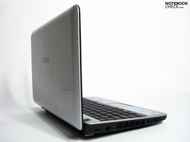 Das in der klassischen Silber-schwarz Kombination gehaltene Testmodell verheimlicht nicht seine Verwandtschaft zu den Medion Akoya E1210 Netbooks die man von Aldi- und Hofer- Angeboten her kennt. Es macht einen insgesamt wertigen Ersteindruck und kann mit einer guten Robustheit aufwarten. Lediglich der etwas nachgiebige Displaydeckel und vor allem die überaus schwachen Displayscharniere trüben das positive Gesamtbild. Im geöffneten Zustand nimmt man schon bei leichten Untergrundvibrationen ein Displaywackeln wahr und kann sich je nach Umgebung deutlich steigern. Dafür hält sich das Gehäuse mit pflegeintensiven Hochglanzoberflächen erfreulich stark zurück, da lediglich der Displaydeckel über ein gemustertes Lackfinish verfügt. Diese Lackoberfläche profitiert von der silbrig-grauen Farbgebung, die Verschmutzungen weniger offensichtlich zur Schau trägt. Der Arbeitsbereich wurde mit einem leicht angerauten Kunststoff bedacht und sorgt so für eine angenehme Haptik. Im matten Displayrahmen findet man die Webcam und das integrierte Mikrofon für die übliche Kommunikation.