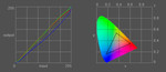 Das Diagramm der Farbdarstellung zeigt einen einwandfreien Verlauf der Grün und Rot Kurve, und die leider schon übliche Abweichung der Blaukurve mit resultierender warmer Bilddarstellung.