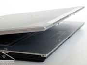Die Scharniere funktionieren präzise und es ist beinahe kein Nachwippen zu beobachten. Das Display ist im Gegensatz zum restlichen Gehäuse nur wenig verwindungssteif. Auch die Spaltmaße nicht so gleichmäßig.