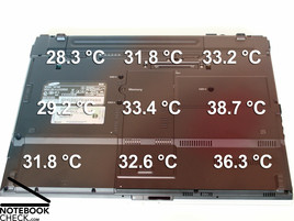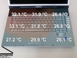 Trotz des ständigen Laufens des Lüfters auch ohne Last mit einer Geräuschentwicklung von 35.3 dB fällt das Notebook nicht unangenehm ins Ohr. Auch die unter Last maximal erreichten 41.2 dB sind durchaus moderat. Das DVD Laufwerk ist mit einer Wiedergabelautstärke von 35.8 dB durchaus akzeptabel. Auffällig war jedoch eine wesentlich höhere Geräuschentwicklung bei der Wiedergabe von Musik CD’s.