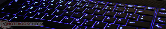 Kommen wir zu einer der ersten wesentlichen Veränderungen zum bekannten XMG P501, der Tastatur. Im aktuellen XMG P502 PRO muss man sich - sofern man eine Einheit mit integrierter Beleuchtung haben will - von der Chiclet-Style-Tastatur des Vorgängers verabschieden. Clevo schwimmt in diesem Punkt absolut gegen den Strom, beinahe alle aktuellen Consumer-Notebooks greifen auf ein Layout mit einzelnen, freistehenden Tasten zurück. Für Chiclet-Fans steht aber auch die alte Tastatur aus dem Vorgänger P501 noch zur Auswahl - ohne Beleuchtung wohlgemerkt.