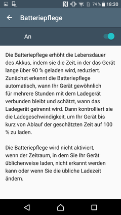 Ein interessanter Aspekt, den wir in unserer zeitlich begrenzten Testphase jedoch nicht beurteilen können, ist die adaptive Ladetechnik von Qnovo. In den Einstellungen gibt es dafür den Menüpunkt Batteriepflege. Damit soll die Lebensdauer des Akkus verbessert werden. Das Smartphone lernt mit der Zeit beispielsweise, wenn man es jede Nacht an den Strom hängt und berechnet dann die Ladegeschwindigkeit, um das Gerät kurz vor Ablauf der geschätzten Zeit auf 100 % zu laden.