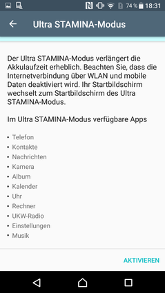 Nicht ganz realistisch, aber dennoch beeindruckend: Bei minimaler Helligkeit und unserem WLAN-Leseskript schafft das Smartphone von Sony fast 2 Tage. Falls man noch mehr Ausdauer benötigt, stehen noch zwei Energiesparmodi zur Verfügung. Der STAMINA-Modus schränkt die Leistung und die Funktionen ein, wobei man hier noch etwas Einfluss nehmen kann. Der Ultra-STAMINA-Modus hingegen schränkt die Funktionalität des Smartphones und dessen Leistung erheblich ein (siehe Screenshot). Der Wechsel in den Ultra-STAMINA-Modus dauert rund 10 Sekunden, beim Verlassen muss aber leider das komplette Gerät neugestartet werden. Die Implementierung bei den Konkurrenten ist hier teilweise deutlich komfortabler.