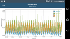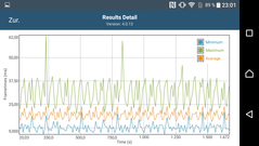 Bereits bei wenig Last wärmt sich der untere Bereich des Smartphones spürbar auf und die durchschnittlichen Temperaturen sind mit 35 °C (Vorderseite) bzw. 33 °C (Rückseite) recht hoch. Unter Last liegen die Durchschnittswerte dann bei rund 40 °C. Das ist zwar spürbar, in der Praxis aber noch nicht unangenehm.