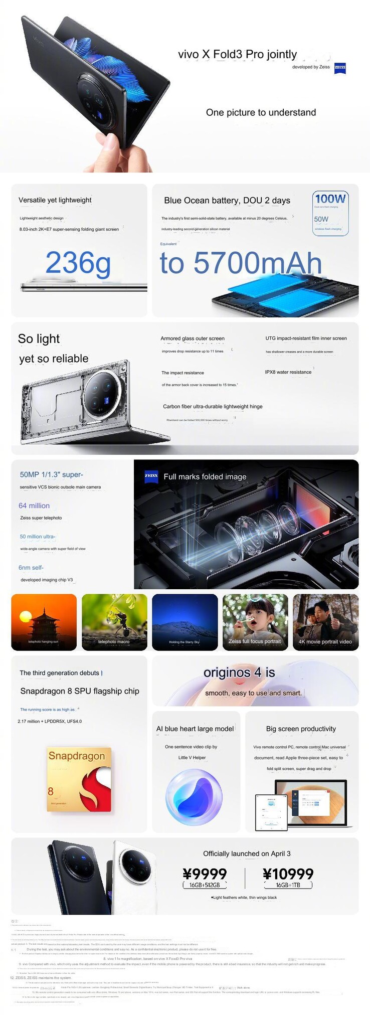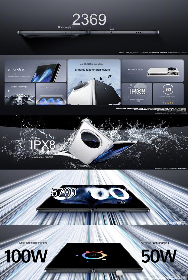 Für Samsung-Fans ein alter Hut, bei Vivo aber erwähnenswert. Das X Fold 3 Pro ist das erste nach IPX8 wasser- aber nicht staubdichte Vivo-Foldable, das allerdings in der Präsentation heute das Eisbad nicht unbeschadet überlebt hatte. Wir hoffen mal, dass die Seriengeräte das besser können, zumal das Vivo X Fold3 Pro ja auch auf einer Antarktis-Expedition mit dabei war und von dort schon einige tolle Kamera-Samples geliefert hat. Trotz der nur 236 Gramm Gewicht packt Vivo einen 5.700 mAh Akku ins kompakte Falt-Handy, der mit maximal 100 Watt per Kabel und 50 Watt kabellos geladen werden kann. Akkukapazität steht also genügend zur Verfügung, Vivo verspricht bis zu 2 Tage Laufzeit.