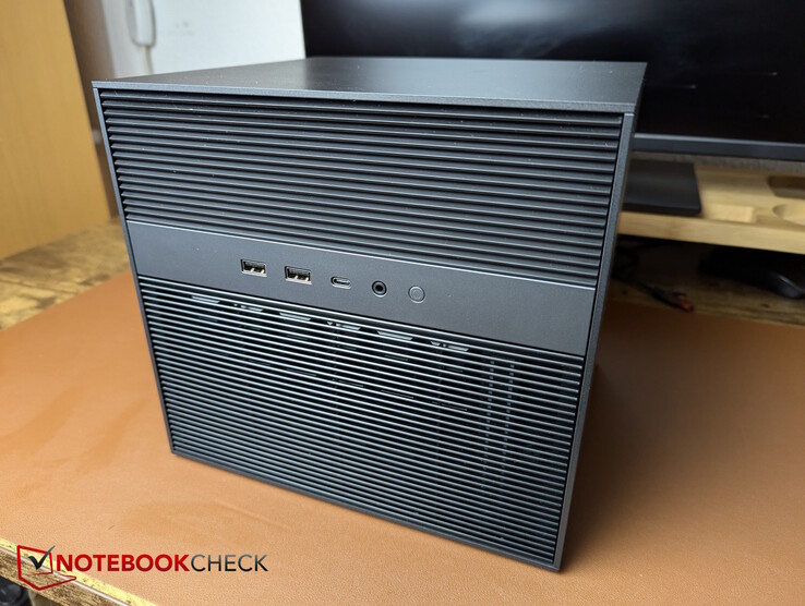 Auf den ersten Blick fällt das würfelartige, schwarze, schlichte Design auf. Schon beim Anheben des verpackten ZimaCubes ist man von dessen Gewicht überrascht, denn das Gehäuse besteht fast ausschließlich aus stabilem Metall. Nur die Zierblenden und die vordere Anschlussblende sind aus Kunststoff.