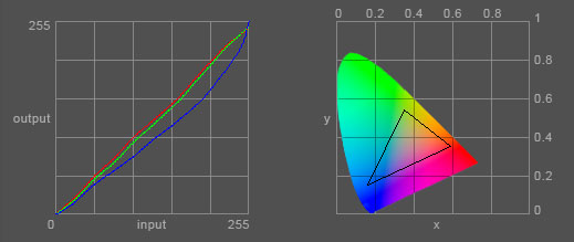 The diagram of the monitor test shows the deviating blue curve like almost all displays, which is caused by a rather warm color presentation. The representable RGB color gamut triangle does not reveal remarkablenesses.