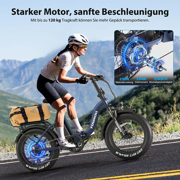 Bis zu 150 km weit lässt sich so komfortabel mit elektrischer Unterstützung fahren. Dies ist die maximal mögliche Reichweite des 720 Wh riesigen Akkus im Rahmen des Touroll S2. Die Tragfähigkeit liegt bei 120 kg, sodass auch einiges an Gepäck auf dem Gepäckträger mitgenommen werden kann.