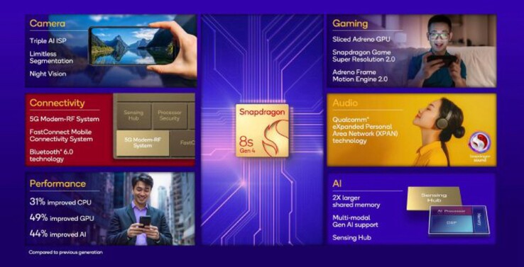 Der 18-bit Triple-Bildprozessor soll Hauttöne in Echtzeit korrigieren können. Offiziell unterstützt der Chip 320 Megapixel Kameras, oder aber die zeitgleiche Nutzung von drei 36 MP Kameras, während Videos maximal in 4K-Auflösung mit 60 Bildern pro Sekunde aufgezeichnet werden können, auch in Dolby Vision und HDR10+. Der Snapdragon 8s Gen 4 unterstützt Wi-Fi 7, Bluetooth 6.0, 5G mit Download-Raten bis 4,2 Gbit/s und USB-C 3.1 Gen 2 (10 Gbit/s). Der 4-nm-Chip kann mit LPDDR5x-4.800-Arbeitsspeicher kombiniert werden.