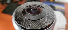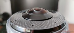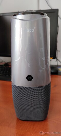 Das Gewicht der Coolpo AI Huddle Pana macht es recht einfach, sie zu transportieren, obwohl sie mit ihren Abmessungen nicht einmal in große Jackentaschen oder normale Laptoptaschen passt. Die Kamera befindet sich auf der Oberseite des grauen Gehäuses, das im unteren Bereich, wo sich der omnidirektionale Lautsprecher befindet, von einem stoffähnlichen Material bedeckt ist. Es gibt eine einzelne Einschalttaste und kapazitive Tasten für die Lautstärke- und Mikrofonsteuerung. An der Unterseite befindet sich außerdem eine LED-Leuchte, die das Gerät umgibt und anzeigt, wenn die Kamera aktiv ist.
