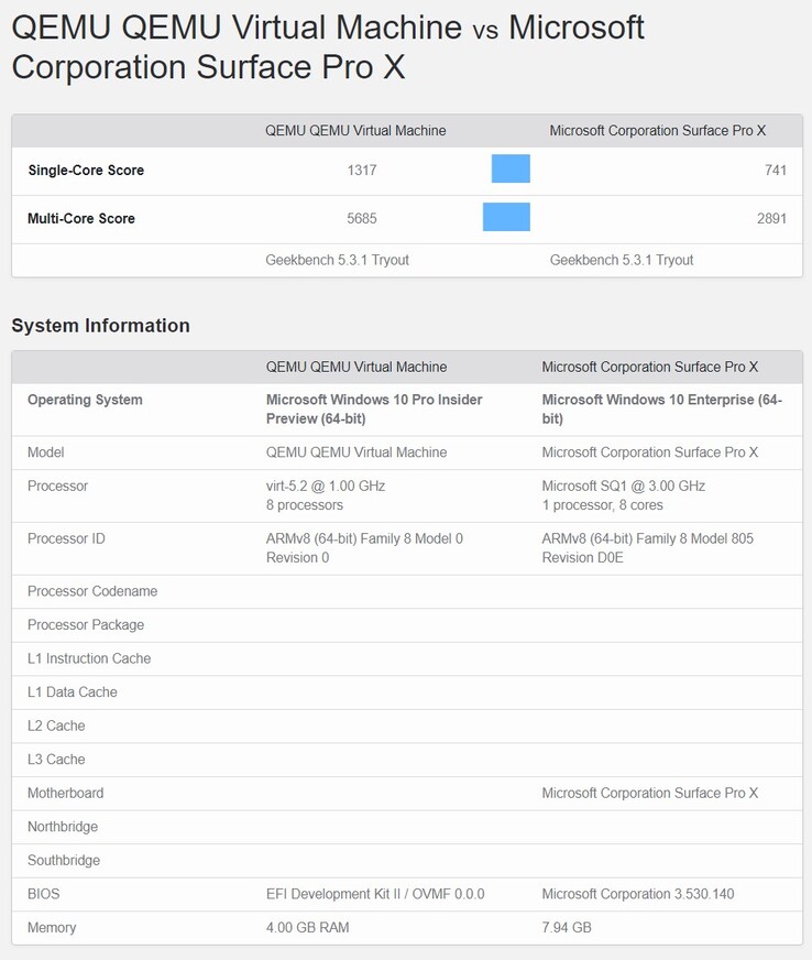 Mittlerweile haben einige andere Entwickler erste Benchmarks eines in QEMU virtualisierten ARM-Windows 10 auf einem Apple M1 Mac durchgeführt und mit dem ARM-Windows 10 auf dem Surface Pro X verglichen, was sehr zu Ungunsten des Microsoft-Tablets ausgeht. Ein Geekbench 5-Run des virtuellen Windows auf dem Mac erreicht etwa Single-Core-Scores von 1288 und Multi-Core-Scores von 5449.