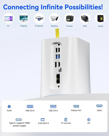 Für Konnektivität stehen neben Wi-Fi 6 und Bluetooth 5.2 unter anderem mehrere USB Type-A 2.0- und 3.0-Anschlüsse, zwei 2,5 Gbit/s schnelle LAN-Ports sowie HDMI, DisplayPort und USB Type-C zur Verfügung. Über letztgenannte Optionen lassen sich bis zu drei 4K-Monitore an dem kompakten Computer anschließen.
