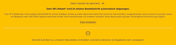 Um auf diesen Preis zu kommen, muss die "Garten & Balkon"-Aktion auf der Aktionsseite aktiviert werden, anschließend wird automatisch ein Rabatt in Höhe von 18 Prozent abgezogen. Dieser Rabatt ist allerdings nicht im Warenkorb, sondern erst im letzten Bestellschritt sichtbar, wofür zwangsläufig ein kostenloser Kundenaccount angelegt werden muss.