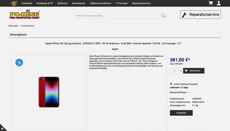 Das Apple iPhone SE der dritten Generation kann in Rot mit 128 GB Speicher aktuell bei PC-King für nur 381 Euro bestellt werden, inklusive Versand kostet das Smartphone damit rund 387 Euro. Apple veranschlagt für das Gerät regulär 569 Euro, im Preisvergleich ist dasselbe Modell ansonsten nicht unter 515 Euro zu finden.