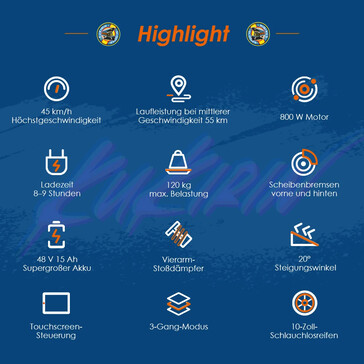 Ebenfalls verbaut ist ein 720 Wh großer Akku (48 V / 15 Ah), der für eine Reichweite von bis zu 55 km langt. Somit sind auch längere Touren mit einer Akkuladung zu bewältigen. Ein Touchscreen am Lenker informiert über die Restreichweite und weitere wichtige Fahrdaten, während vordere und hintere Scheibenbremsen mit Power-Off für einen kurzen Bremsweg sorgen.