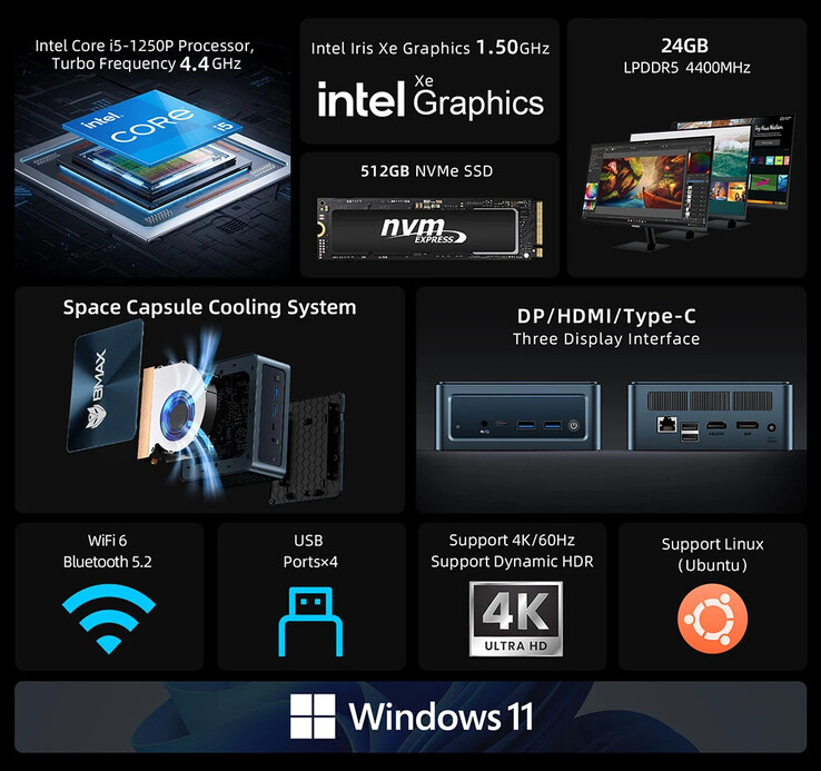 Den Prozessor kombiniert Bmax in diesem Mini-PC mit 24 GB LPDDR5 RAM sowie einer 512 GB großen SSD für Multi-Tasking und schnelle Ladezeiten. Die ebenfalls integrierte Intel Xe Grafik mit 80 Execution Units und 1,4 GHz Spitzentakt unterstützt die Grafikausgabe auf bis zu drei 4K-Bildschirmen mit 60 Hz. Hierfür stehen je einmal DisplayPort, HDMI und USB Typ-C zur Verfügung. Ein HDMI-Kabel ist im Lieferumfang enthalten.