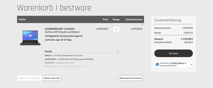 Das Schenker Key 14 (M24) wird auf Bestware bis Freitag um 15:00 Uhr mit 550 Euro Rabatt angeboten. Da dieses Modell ausschließlich bei Bestware verfügbar ist, ist dies auch im Preisvergleich mit Abstand der günstigste Preis für das Notebook. Interessant ist das Angebot auch, weil Kunden die Konfiguration vor der Bestellung anpassen können.