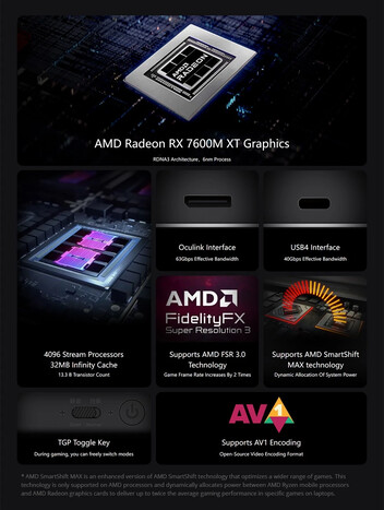 Praktisch ist die TGP-Umschalttaste am GPD G1. Mit dieser kann zwischen einem leisen Modus mit 60 W TGP für weniger Betriebsgeräusche und dem normalen Modus mit 100 W TGP für mehr Leistung gewechselt werden. So lässt sich die Grafikleistung je nach Bedarf auf die jeweilige Situation abstimmen. Weitere Highlights sind die AMD FSR 3.0-Technologie für eine besonders hohe Bildrate sowie die AMD SmartShift MAX-Technologie für eine dynamische Zuweisung der Systemleistung.