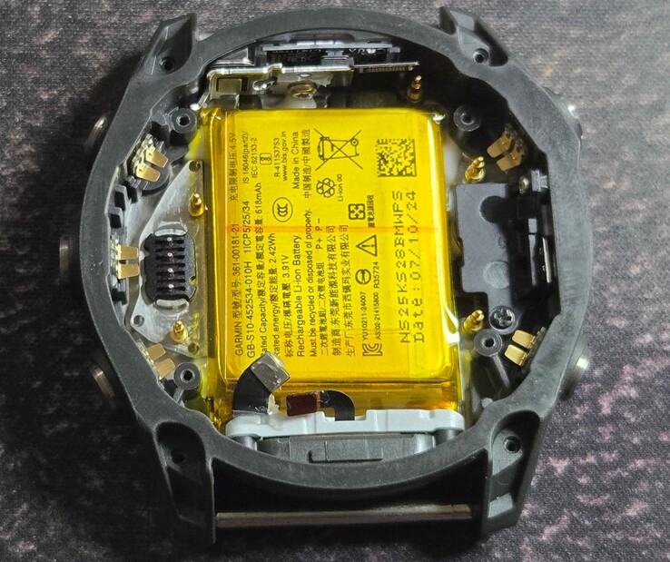 Garmin verbaut exakt dasselbe Sharp LS014B7DD01 MiP-Display wie schon bei der Fenix 7. Der Akku fällt mit einer Kapazität von 618 mAh immerhin 16 Prozent größer aus als beim Vorgängermodell, die Batterie wird allerdings weiterhin ins Gehäuse geklebt, was den Austausch erschwert. Enttäuschend ist, dass Garmin denselben NXP i.MX RT500 wie schon bei der Garmin 7 verbaut. Der mittlerweile etwas in die Jahre gekommene ARM-Chip besitzt nur einen Cortex-M33 Kern mit Taktraten bis 200 MHz und maximal 5 MB Arbeitsspeicher.