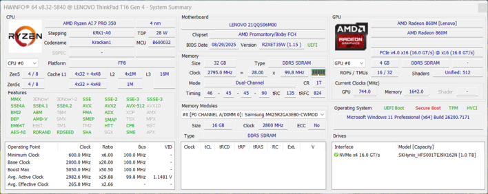 | Lenovo ThinkPad T16 Gen 4 21QQS06M00 AMD Ryzen AI 7 PRO 350 ⎘ AMD Radeon 860M ⎘ 32 GB RAM, 1024 GB SSD | Amazon: 1.877,84 € Bestpreis 1926€ notebookstore 2. 2164.26€ galaxus 3. 2208.99€ bueromarkt-ag.de | 2 kg | 18.1 mm | 16.00" 1920x1200 142 PPI IPS | |