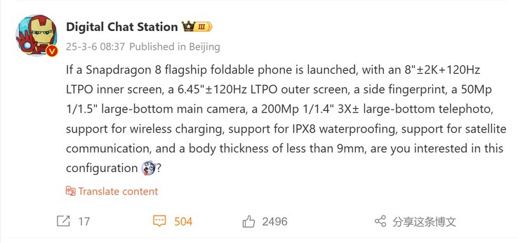 Spannend sind allerdings die Kamera-Specs, die offenbar mächtig aufgerüstet werden. Neben einer vergleichsweise großen 1/1.5 Zoll 50 Megapixel Hauptkamera soll demnach auch ein 1/1.4 Zoll großes Telefoto mit 200 Megapixel Auflösung und etwa 3x Zoom verbaut sein, was eine Premiere im Foldable-Bereich wäre. Laut diversen Kommentatoren auf Weibo dürfte es sich allerdings nicht um einen ISOCELL HP9 sondern einen ISOCELL HP3 handeln. Neben Wireless Charging und IPX8 Zertifizierung soll das Foldable dünner als 9 mm werden, mal sehen ob auch die 8,9 mm des Oppo-Foldables unterboten werden.