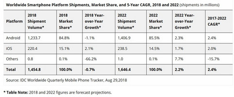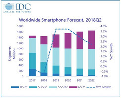 Die Marktforscher von IDC rechnen in ihrer neuesten Analyse damit, dass der weltweite Smartphone-Absatz ab dem zweiten Halbjahr 2018 mit einem Volumenwachstum von 1,1 Prozent gegenüber dem zweiten Halbjahr 2017 wieder zulegen wird. Allerdings geht IDC davon aus, dass die rund um den Globus ausgelieferten Smartphone-Stückzahlen für das Gesamtjahr 2018 leicht um 0,7 % auf 1,455 Milliarden Geräte sinken wird. In der langfristigen Prognose erwartet IDC, dass der gesamte Smartphone-Markt bis zum Jahr Jahr 2022 wieder ein gesundes Wachstum zeigen wird.