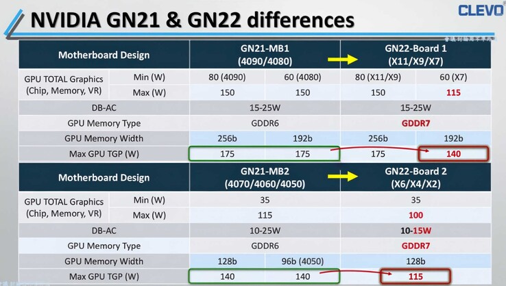 Laut der Daten von Clevo gilt dieselbe TGP für alle X2-, X4- und X6-Varianten dieses Grafikchips, was darauf deutet, dass die Verlustleistung der GeForce RTX 5050 und der GeForce RTX 5070 Laptop-GPUs ebenfalls auf 115 Watt beschränkt wird. Die Nachfolger der GeForce RTX 4080 und der GeForce RTX 4090 Laptop-GPUs können dagegen wieder auf maximal 175 Watt zurückgreifen, inklusive 25 Watt Dynamic Boost. Eine X7-GPU, die zwischen der GeForce RTX 5070 und der GeForce RTX 5080 sitzt, kommt neu hinzu, und wird mit maximal 140 Watt betrieben. Nvidia wird die ersten GeForce RTX 5000 Laptop-GPUs voraussichtlich im Frühjahr 2025 offiziell vorstellen.