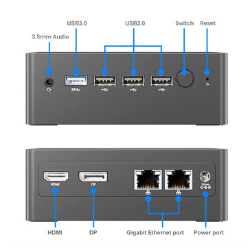 Mit der integrierten Intel UHD Graphics mit 24 EUS kann der Mini-PC bis zu zwei 4K-Bildschirme mit maximal 60 Hz versorgen. Hierfür stehen einmal HDMI 2.0 und einmal DisplayPort zur Verfügung. Dazu runden diverse USB 3.0 und 2.0, zweimal Gigabit-LAN sowie ein Audioport die Anschluss-Armada des Aoostar N100 ab. Gefunkt wird mit Dual-Band Wi-Fi 5 und Bluetooth 4.2.