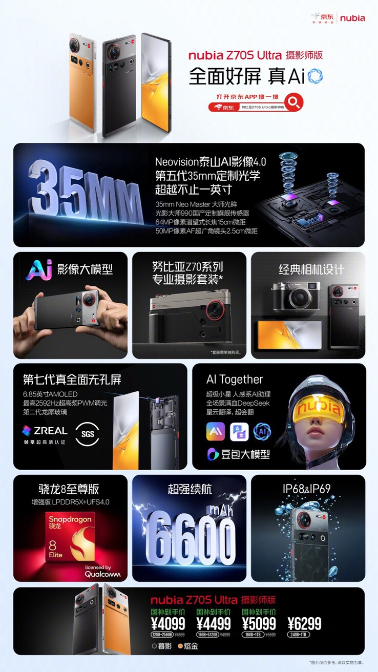 In Zusammenarbeit mit Fotorgear hat Nubia darüber hinaus eine Reihe von Aufsteck-Objektiven entwickelt, welche die 35 mm Hauptkamera in eine 135 mm oder 400 mm Tele-Kamera verwandeln, oder aber um ein Fischaugen- oder Makro-Objektiv erweitern können. Durch den 6.600 mAh Akku soll das Nubia Z70S Ultra eine besonders lange Laufzeit erzielen. Das Gehäuse ist nach IP68 und IP69 zertifiziert, sodass das Smartphone wasserfest ist.