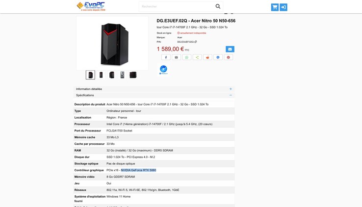 Nachdem kürzlich bereits die wichtigsten Spezifikationen der Nvidia GeForce RTX 5050 und GeForce RTX 5060 geleakt sind, listet der französische Onlineshop EvoPC nun bereits einen Acer Nitro 50 auf Basis der neuen Grafikkarte. Der Händler listet die Nvidia GeForce RTX 5060 gleich an zwei Stellen, und spricht auch explizit von 8 GB GDDR7-Grafikspeicher, sodass ein schlichter Tippfehler unwahrscheinlich wirkt.